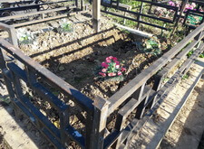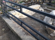 Возвращаемся на могилу. Подготавливаем оградку к покраске, зачищая её от старого покрытия. Параллельно устанавливаем подставку для памятника.
